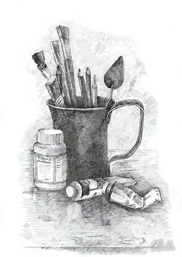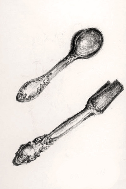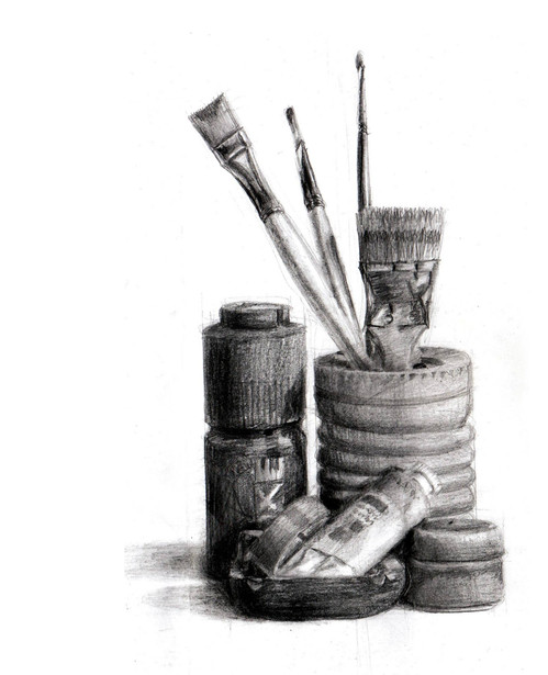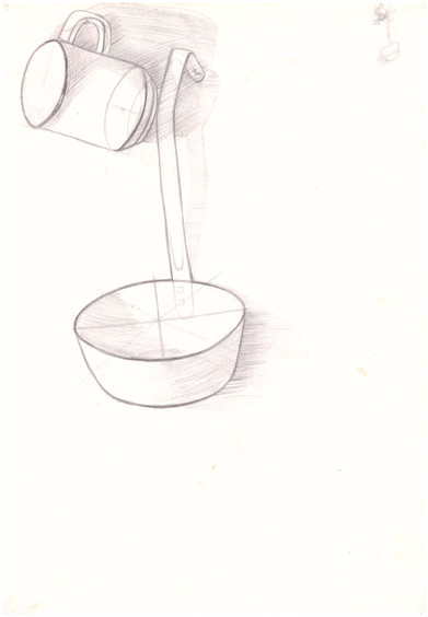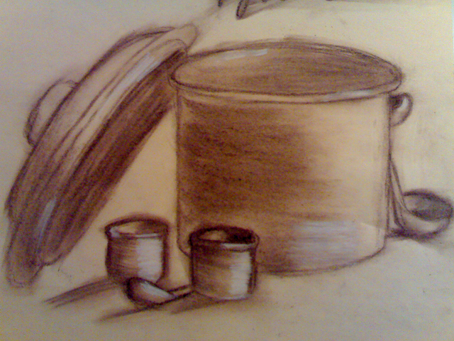 Another art class assignment.I will confess that I ADORE this piece. I don't care if you don't like it. Screw you. I LOVE it, and I usually don't like my art production. I don't think we were supposed to really dwell on specifics/shading and all that....anyway, two point perspective, but I think I used a bit more in there.... Can you tell that it's a pot rack in our kitchen? I was looking up at it as I drew it. My neck hurt afterwards. The thing in the very left corner was our little ceiling in-built light. I didn't bother with shading too much unless it was really obvious. I tried to get the shiny metallic effect, but got LAZY. I especially like the handles and the shadowing on those...