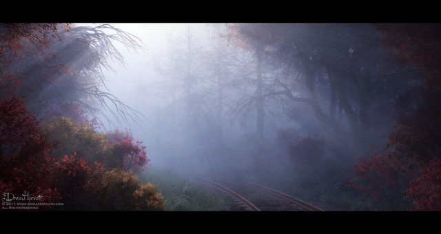 I got inspired by a similar photo (with similar toning) of rural train tracks in the morning mist. For the tracks I used Sketchup meshes for the rails and the anchors, and I created the shaders in Vue. The wooden ties are just primitives with textures, bump and specular maps I made.Created and rendered in Vue, postwork in PS as usual (plus a little bit of Filter Forge for enhancements). ...now that I'm looking at it again, it totally looks like an Instagram photo...