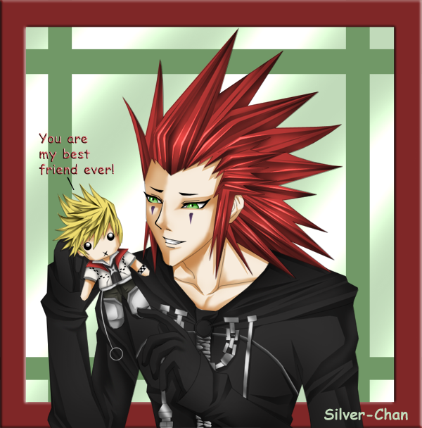 Aww, cute picture! I love the little Roxas doll and the way you drew Axel's face!