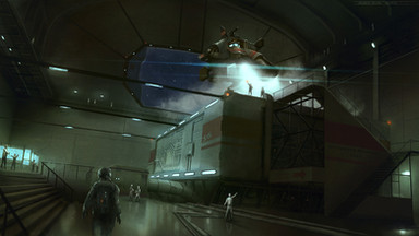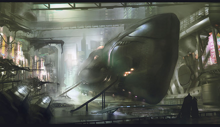 Realistic depiction of a hangar. In science fiction, this gets extra brownie points from me! Even better as you have a marine with a saber conducting inspection!