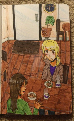 Two of my OCs, Sammy (long hair) and Eden (glasses) enjoying their morning cup of coffee. They're girlfriends. :hearts:Drawn for an Inktober 2017 prompt.