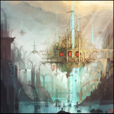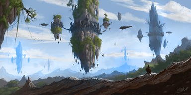 How wonderfully inspiring! A city in the clouds, tucked away from the world bellow, hiding from the strife that they fear they might find. A man and his hunting eagle look up in aw at the airborne island in front of him, hoping that a better life awaits him there.