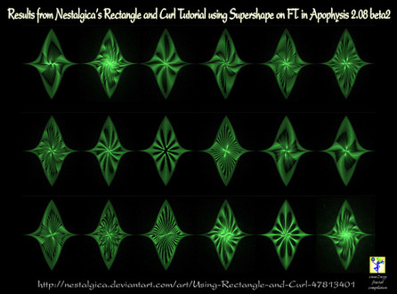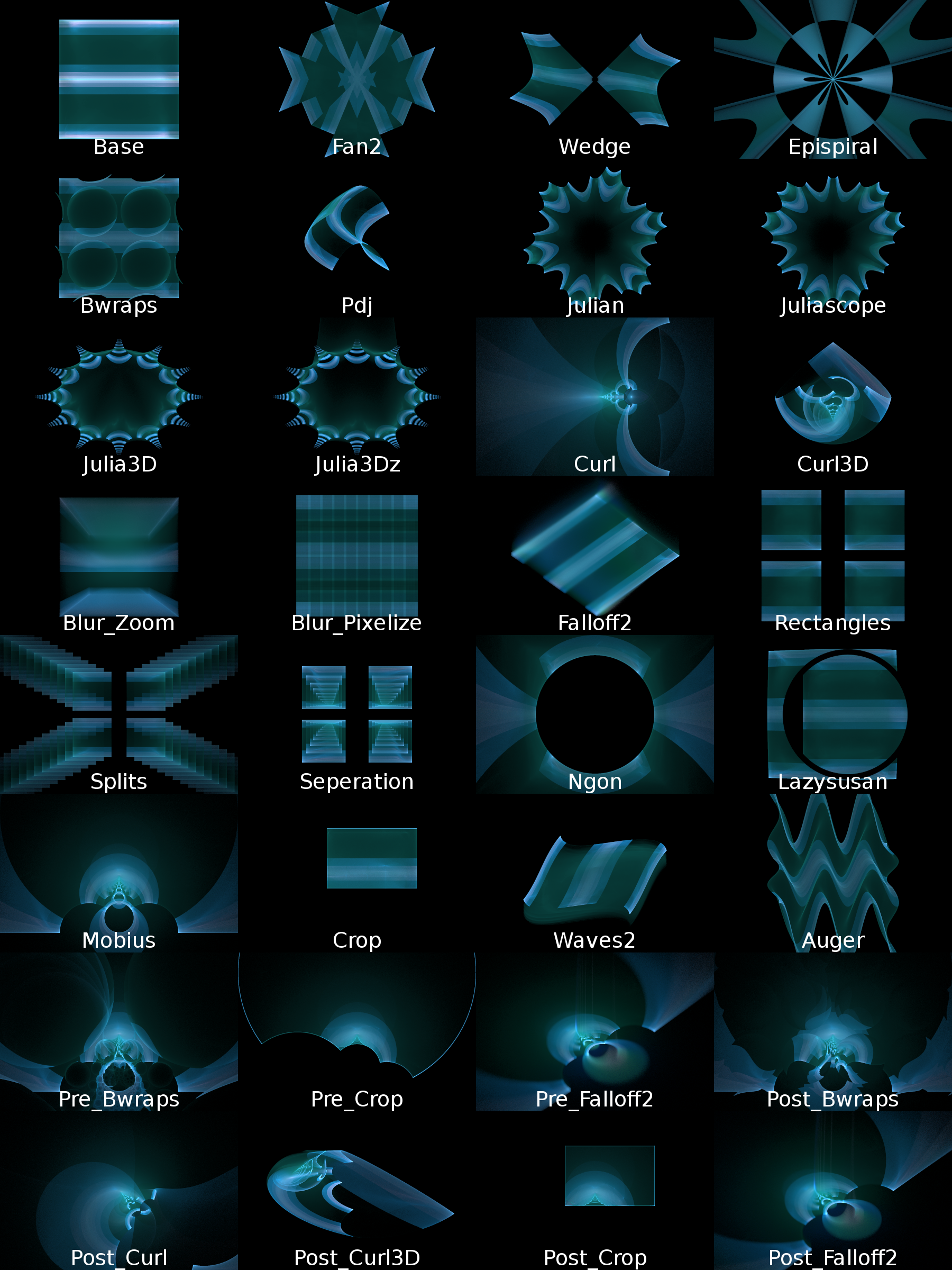 The first volume of reference flames I made for myself. This volume is all of the native variations in Apophysis 7x that have more then 2 variables. I wanted to be able to see what all the parameters looked like without having go through all the variations for each transform.Included in the 7z file is the picture, a flame file with all the flames in it and a readme file with my various notes on the different variations, what the variables do and some links to some dA tutorials that I found very helpful. The flame file makes use of the stripes plug-in so make sure you have that. 3D flames have a pitch and yaw of 45 degrees and pre and post variations were all used with the mobius variation because it projects onto itself well.