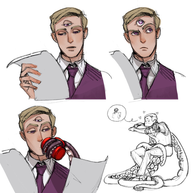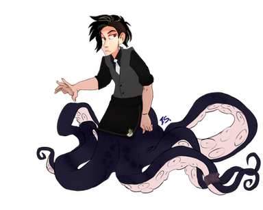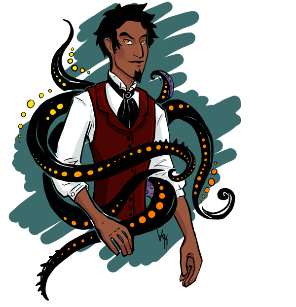 He was studying octopi and testing chemicals and shit when he had an accident, getting covered in the substance. This mutated him mostly on his face and back, growing four octopus tentacles and causing the eyes on one side of his face to multiply and his mouth to warp, sharpening his teeth on that side.