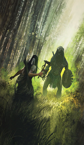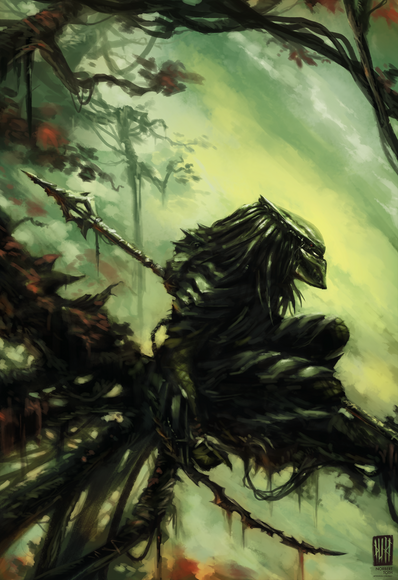 "I'm going to keep this simple, black and white, just sketching, high contrast, the yautja in shadow, nothing elborate..."midway into the drawing and too many vines later: "it needs to be green".... "Dammit! Put the stylus down! no more drawing, time to move onto the next project."