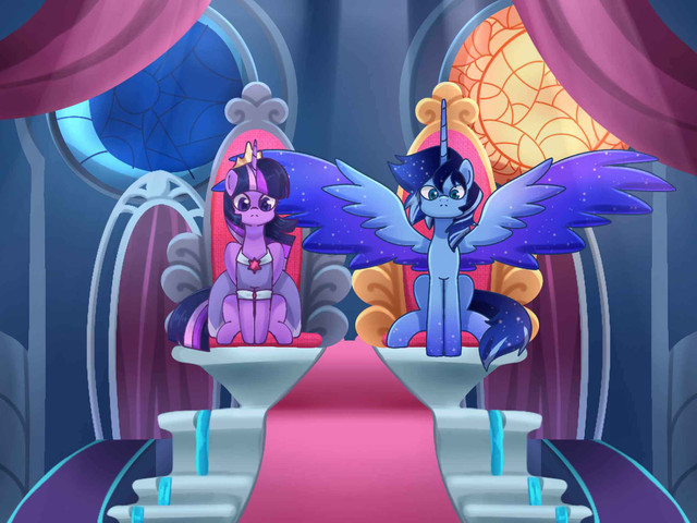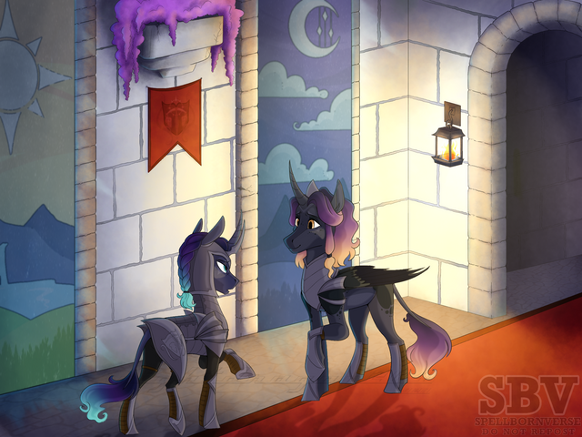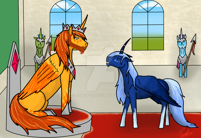 Walking the halls of his castle, King Corvus wondered to himself if he was doing the right thing. It was important that the kingdom have a strong leader, one that would not bend to the wills of others... but the Prince was nothing like that. Skyfall is too shy, quiet and over all far to naive. However there was no other choice that he could see, he had no foals of his own and Skyfall was the only other member of the royal family. There was also the fact he was an Alicorn. That was incredibly dangerous, should the people ever find out there would be revolts and calls for his death.