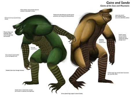 Integument: Like some ground sloths, it has a layer of osteoderms underneath its skin. This allows it to be almost impenetrable by both spears and most types of bullets. It's true fur color mostly reddish-brown, with the red color being enhanced by the red algae that grows on its fur due to its slow metabolism. It has a large, black stripe across its chest and a black snout with a black circle on its forehead, giving the appearance of this creature as having a mouth on its belly and a single eye.