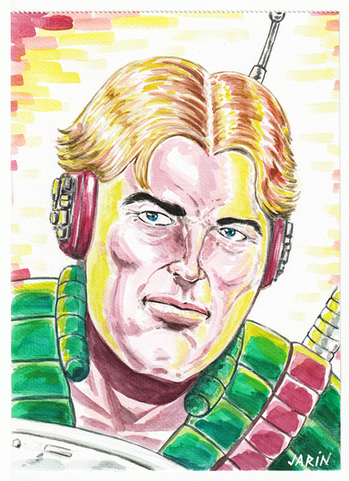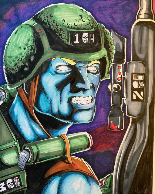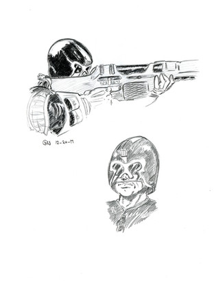 My Drawing table with reference material (my collection) for my next drawing. That drawing would be the guy with no eyes in the middle.Rogue Trooper and 2000AD