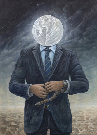 So in short, my interpretation would be that it is about venturing out into what is unknown and mysterious. The clouds below covering up the world that is being left behind.