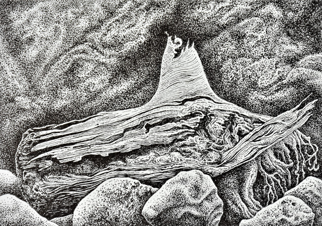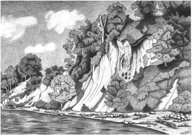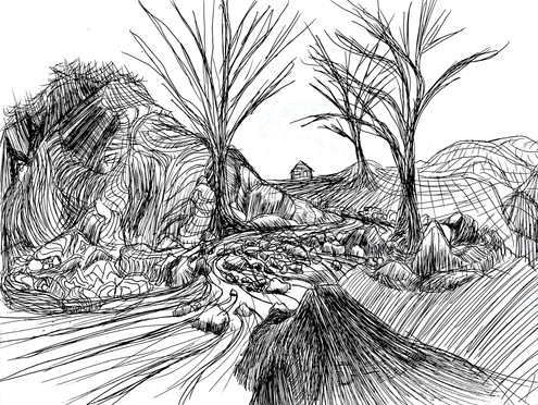 A mindscape, symbolizing human life as a process in time and space. On the river bank I have placed a big mindstone, symbolizing my actual state of mind in relation to this process. A lot of turbulent things have happened during my lifetime, which my drawing expresses by the storm damaged trees and bushes by the riverside. The worn, but resistant mind stone shows the relative permanence of man’s intellect and spiritual capacity meeting the destructive powers of nature.