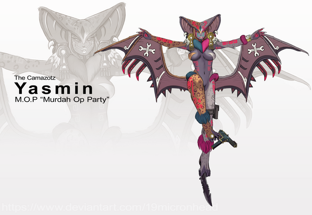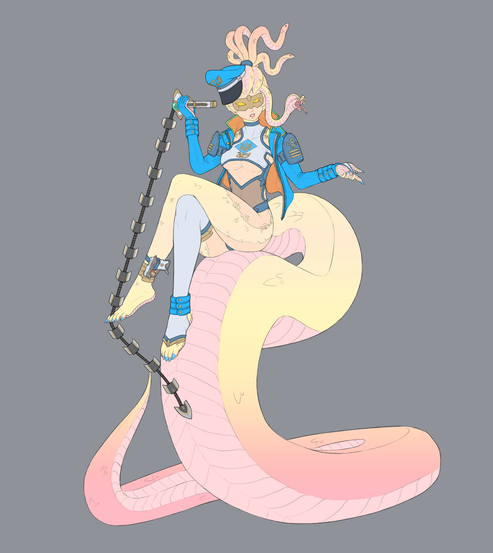 On the ideas I just take a bunch of stuff that inspired me at the time and I was thinking I wanna do something with a guilty gear vibe and a chainsaw guitar and I also want to do a wing with a creepy bunny head on it that shoots lazers out of its mouth, and then I was like oo! oo!Β and I wanna add horns and some flowers and a biker jacket xD and uh....Β