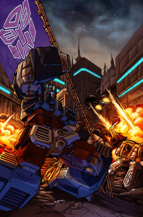 I can easily imagine Steve Jablonsky's musical score for the first "Transformers" film going along with this image, especially that short snatch of melody from "You're a Soldier Now" that plays when Optimus plows into the downtown area, transforms, and growls, "Megatron!" This is some of the best Transformers artwork I've seen here, particularly for ol' Sunstreaker!