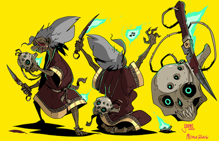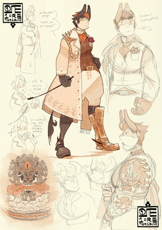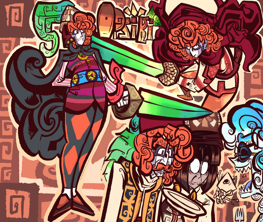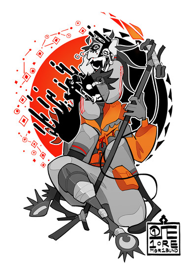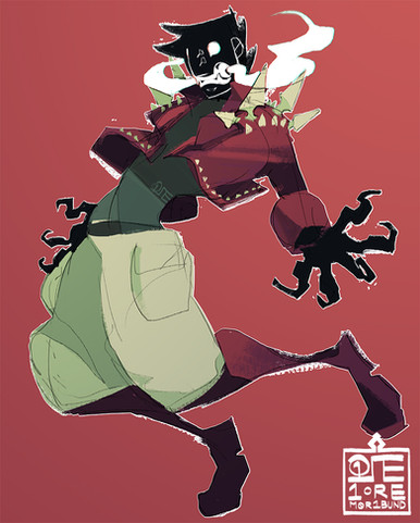 [Image: Itβs a minimized Sadren and a less minimized Sinuk. Sadren is wearing his conical kasa hat with many veil-like ribbons dangling off the wide brim. His eyes and face are painted with god's blood, and so is the oversized dagger that he carries in both hands. The blood spatters on the floor, creating constellation patterns. Sinuk, on the other hand, is blacked out. She's screaming stardust and violence magenta and is contorted inside a claustrophobic frame.]