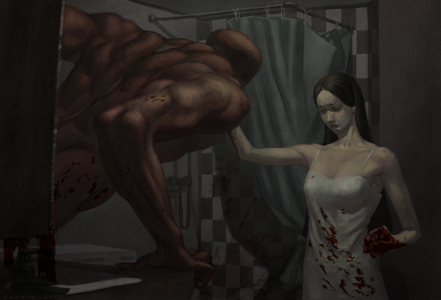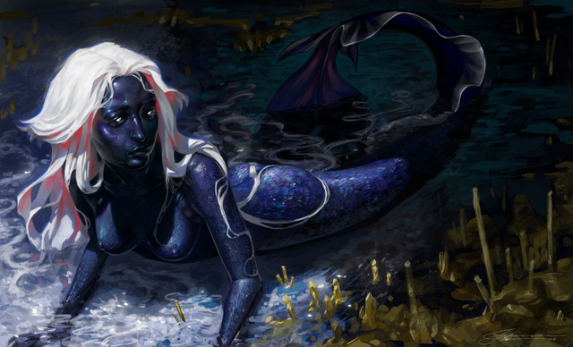 Alba is a character of my artist friend (her works were published on other platforms under the nickname yduolc). It's a kelpie, but it can also have a human form, in addition to its true equine form. Abandoning the life in which she carried the lives of people under water, she left her lake, began to live differently with creatures like her. She is calm, peaceful, patient. But if you make her very angry, she can hit.In my work, I depicted Alba as a girl. She ate her victim. Here the Kelpie is calm, in its habitat. But, most likely, she is disgusted by what she has done.