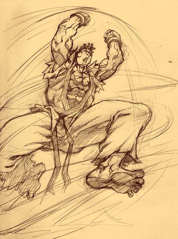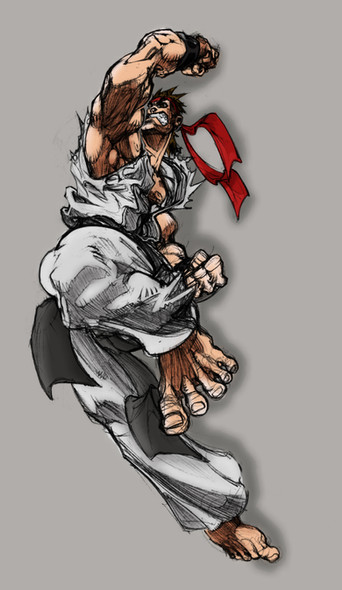 Just another Ryu picture, of course. Getting tired of drawing pictures with little action, so I decided to draw this. Just one of those cool-to-look-at kicks.Again, I tired something different colour wise, but it just ended up being a bit grey. Never mind, I shall carry on the onslaught against my old enemy: Colour.