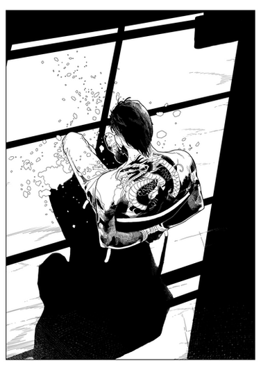 I really like this a lot. I'm a big fan of solid black and white... and with his arm also in the blackness, it's less clear what exactly this stuff is. Water? Some sort of black ooze? It's hard to tell if it's flat or curling around him.
