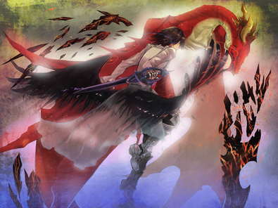 Here we have Azel riding her imposing dragon, Atolm. This is a scene from Panzer Dragoon Saga where you, as Edge (in the 3rd panel), first have to fight Azel - I can remember being amazed by the size of Atolm when I first saw him! After a while, Azel commands her dragon to let loose a fierce move called Berserker Rage. She calls out 'Ne-Rai' which roughly means 'Aim', but I always liked the meaning I once read in a magazine, 'Rain death on him'.