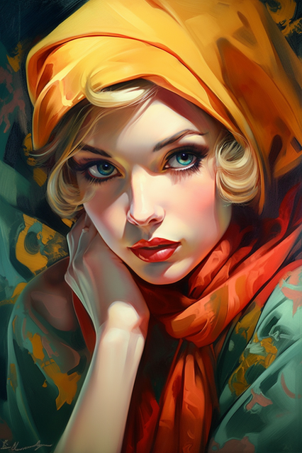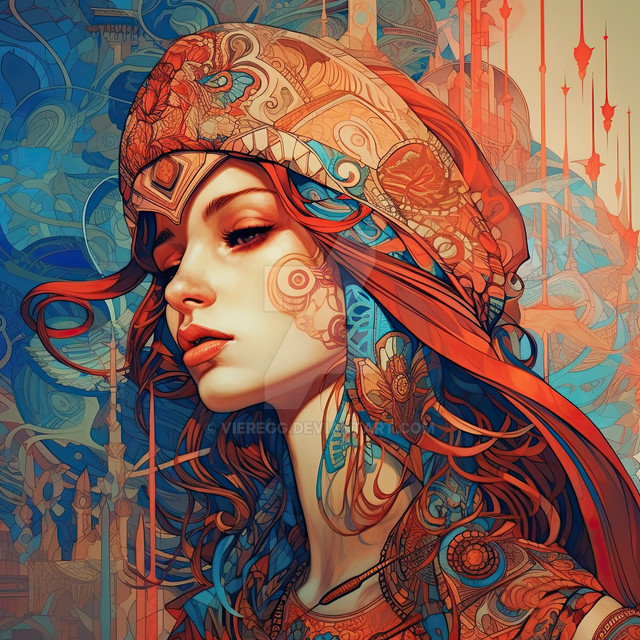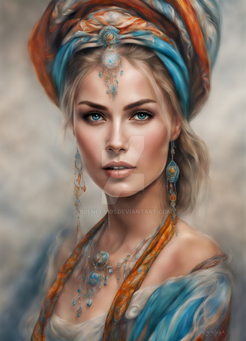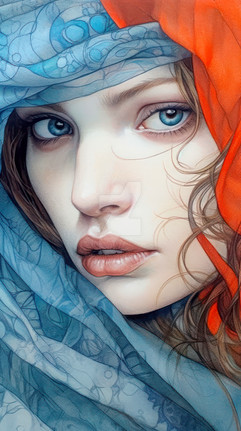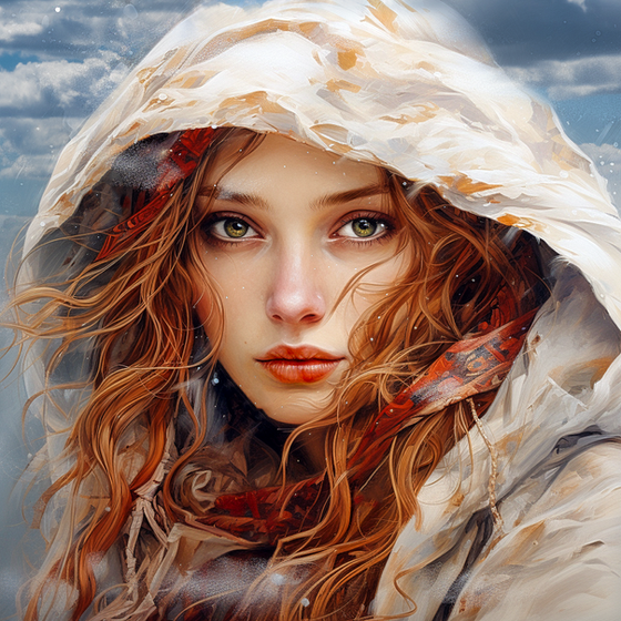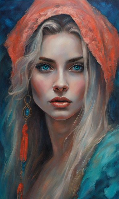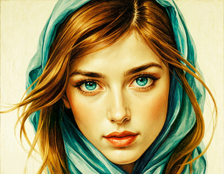#artwork #beautiful #blue #closeup #colour #colourful #drawing #elegant #eyes #face #female #ginger #hood #interesting #lady #macro #paint #painting #portrait #red #redhead #romantic #simple #toned #traditional #wallart #warm #woman #aiart #aiartwork