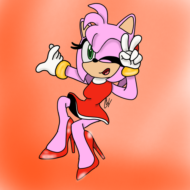 [FULL DISCLAIMER: I very rarely, if ever, add color to my drawings solely because they don't translate well whenever I try editing and posting them online. The last time I fully depicted a drawing fully in multicolor was in my Sedusa pic, link: www.deviantart.com/2gredvision… , which happened a long time ago, and even then was challenging for me to perform. In other drawings I usually just tint the entire pic in one color via editing or add a little color in small details for emphasis/ thematic purposes. However, because of how easy the circumstances of this request's make-up was, I chose to commit to adding more color to it, as a way to make it look special. But with that in mind, please don't ask for requests and expect them to be in color. It's a very rare option for me, nerve-racking even, and it's usually something I just don't do often due to how complicated it is. Very sorry about this, but I have to mention it before anything else. Now with that said...]This was a request made by 4ATOMIC4, link:www.deviantart.com/4atomic4 , where I was asked to draw Amy Rose, from the Sonic The Hedgehog franchise, wearing red high heel shoes. A peculiar request, but I chose to have fun with it nonetheless . Amy wearing red heeled shoes is surprisingly nothing new, as she did wear some along with a long red dress and white opera gloves in an episode of the Sonic X anime. However in this case, the heels of these shoes would be slightly longer, thusly explaining why she looks slightly taller in this pic. Think of it as Amy trying on some big girl shoes, and thinking that it would attract Sonic . Due to how light Amy's design and color palette is, for this pic I chose to do something rare and put her completely in color, simply because I felt that she might look a little bland just in black and white. Plus, it helps emphasize her red shoes. So with that in mind, I hope it looks alright, and please be fair with the color results .