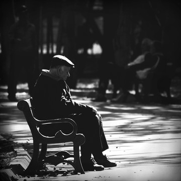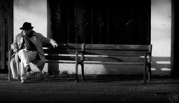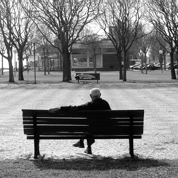 et il est assis sur l'extreme bout, on dirait qu'il laisse de la place aux autres. c'est si grand et il n'y a personne. ca accentue encore cette impression de solitude.
