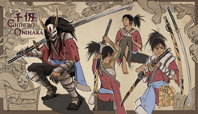 Acompanhando-o também estão as armas que já conseguiu recuperar - katanas, naginatas, shurikens, onos (machados). Elas flutuam e o ajudam no combate.