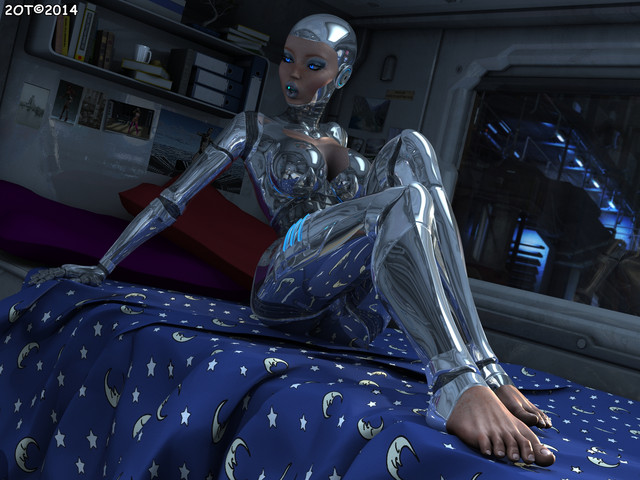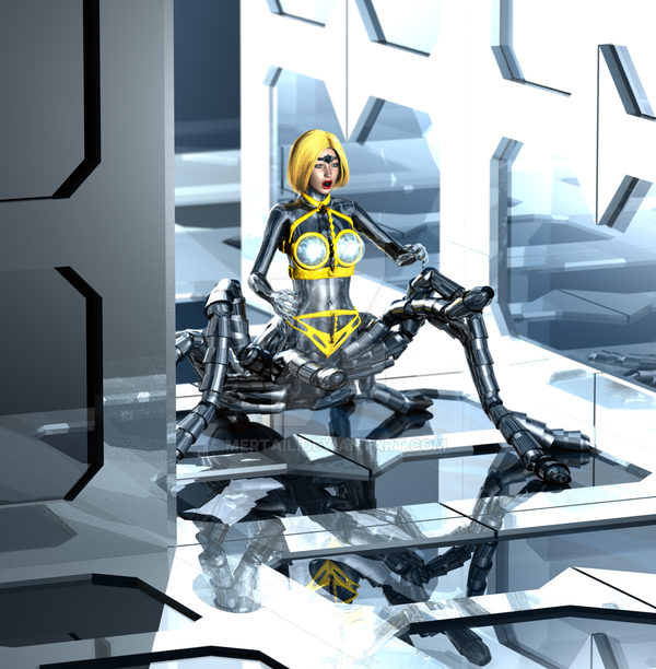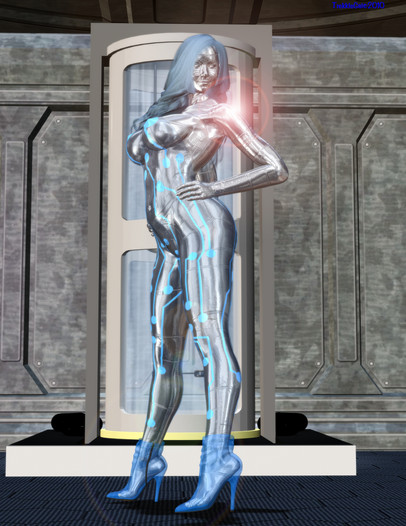 She went under it as human and went out as gynoid. It was so instantly... Drops of metal on her flash, it's feels cold, but normal. She went on to and suddenly sense that metal drops already not cold... or not, it was same temperature as her metal body. Look down she saw amazed a big metal breasts... Now she is gynoid. Happy sexual gynoid.