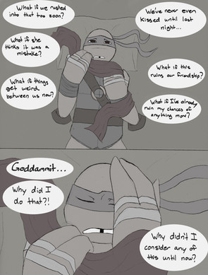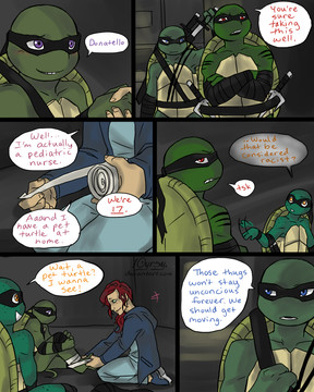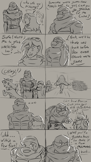 So.. I really love the poses I used in previous post with April n Leo and I wanted to use it again... (Ok maybe just maybe I do ship em... just a little bit... tiny bit...) so I made this little short comic I randomly came up with out of boredom and redrew from the original hug cause I adore it very much <3 Plz dont hate me lol...Also introducing Casey here a bit. ;3 This was pretty much another break drawing from refs.