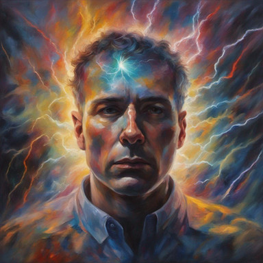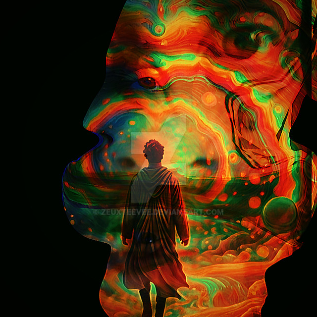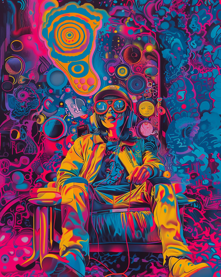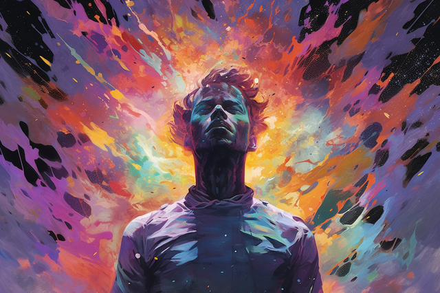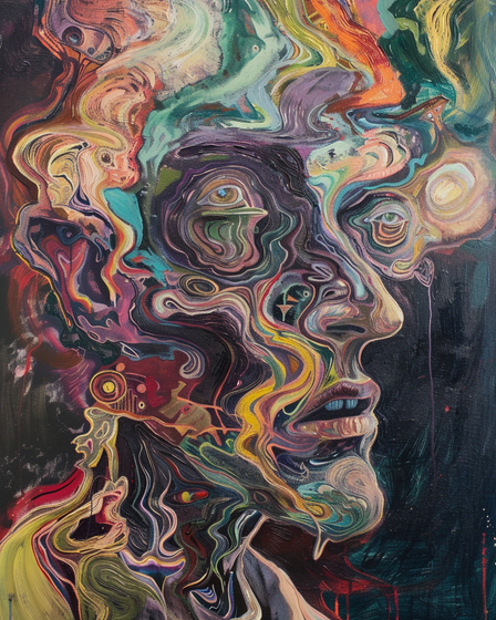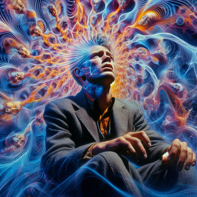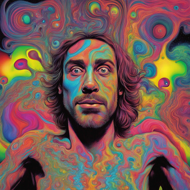 In the acid's intoxication, reality shatters like mirrors on a glass floor. The man loses himself amidst psychedelic lights, consumed by the abyss of his distorted mind.Related content