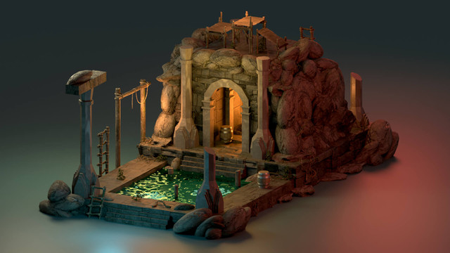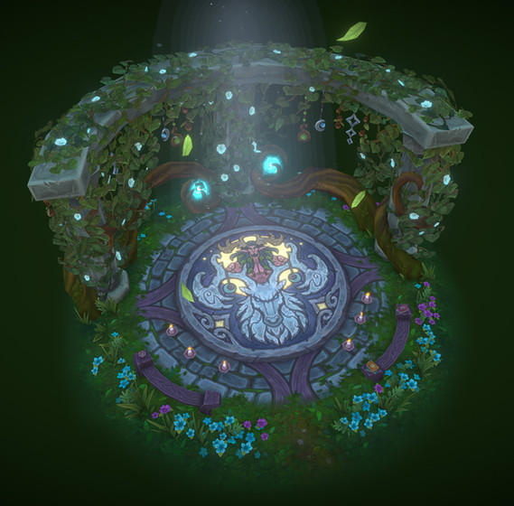 Стилизованная сцена с магическим кристаллом в окружении мелких кристаллов, осколков, каменные колонны со светящимися магическими символами, высеченными в камне, колонны оплетены древними деревьями, лианами, сцена дополняется черепами, расположенными в разных местах сцены, под на главном кристалле есть замерзший волшебный колодец, всю эту сцену дополняет мох, поросший во всех укромных местах!Модель состоит из 4-х материалов, которые отзеркалены на вторые UDIM для улучшения качества текстур!