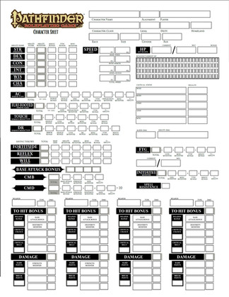 This character sheet was heavily based off of the official one, but I consider it more printer friendly and it doesn't give me a headache looking at it. And yes, if you've ever looked at any of my other character sheets, you'll see that I often use a boot for speed/movement, a shield for armor, and a heart for hit points/health.