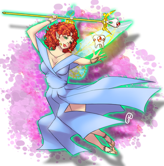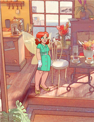 It's cool to be able to contrast the very different colouring styles you guys both have. I really like the border you've drawn, and the nice shine on her shoes and hair. Her wings look glorious as well!
