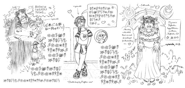 Lineart with black liner, colored with Copic markers and watercolor pencils.