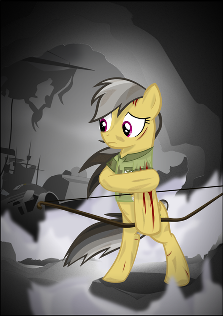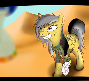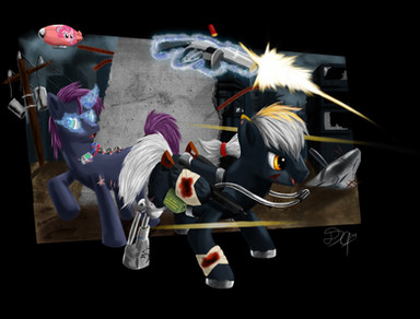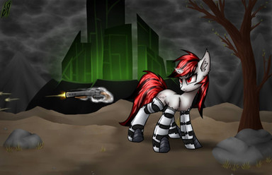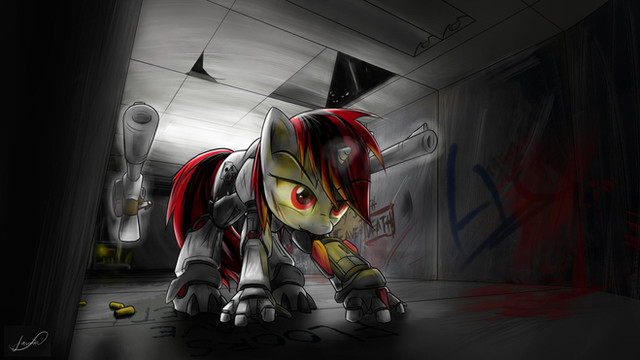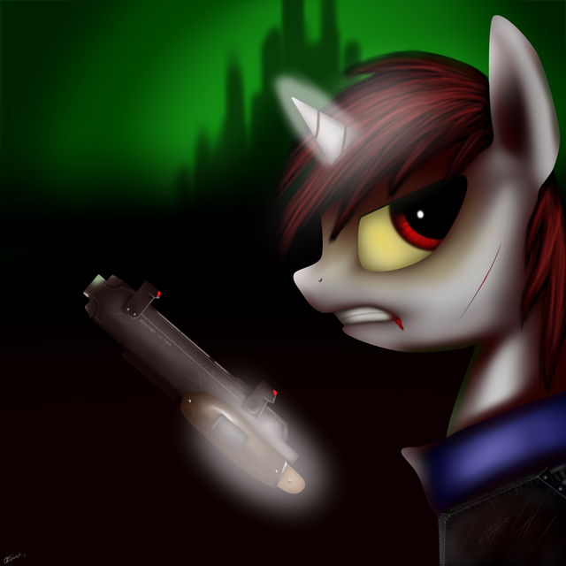 Easy. I redesigned the gun a little, so earth pony or pegasi can use it without any problems. Actualy, it's a twin pistol. She's holding it by the horizontal handle. Triggers hidden inside the handle, so she uses her tongue. Shutter still slides verticaly. Foresight and rear sight also changed comparing to human version. Magazines are still on the bottom cuz I don't see any reason to change it.