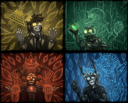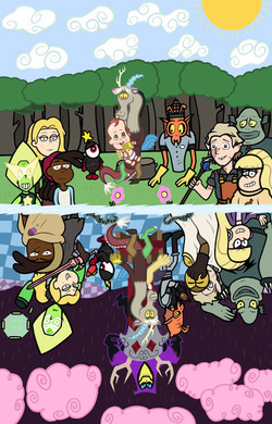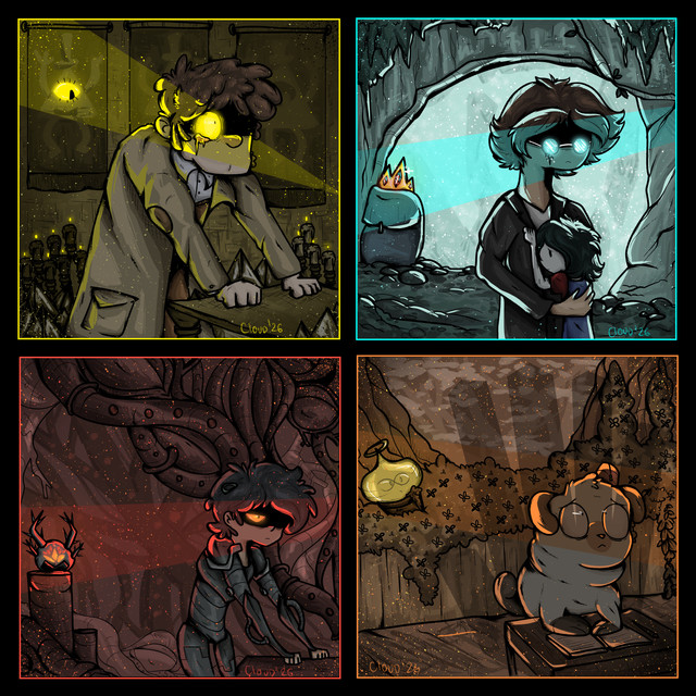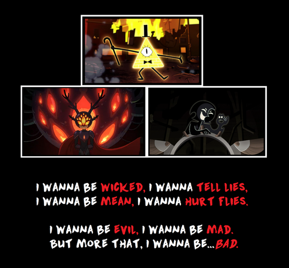It’s been a while since I’ve done a more epic drawing, particularly one with a poem to go with it. So I decided to make another. Here in this pic are four (technically eight) characters from four different Disney shows, Gravity Falls, Star Vs The Forces Of Evil, Amphibia, and The Owl House. Specifically Stanford Pines, Ludo Avarius, Marcy Wu, and Hunter, along with apparitions of each character who possessed or controlled them at some point during their respective series, Bill Cipher, Toffee,