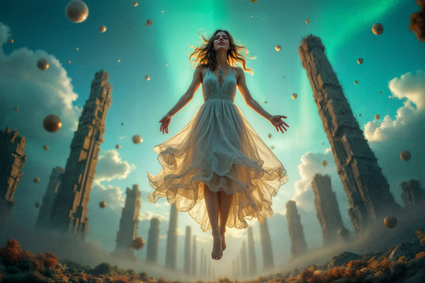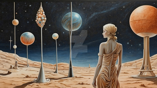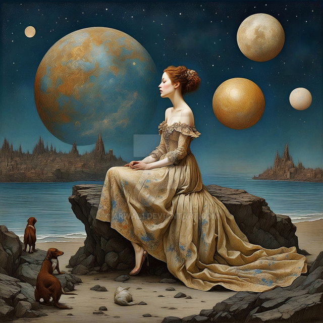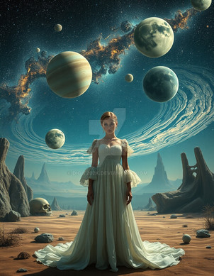 #beauty #surreal #blondhair #celestial #cosmiclandscape #cosmos #desert #dreamscape #elegant #ethereal #exploration #fantasy #femalecharacter #globes #imaginative #moons #mysterious #ornate #otherworldly #planets #softlight #space #stargazing #surrealism #victorianstyle #whimsical #offshoulderdress #brassobjects