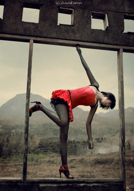 And she defies the laws of physics. Very creative. I thought the wall was water at first glance.