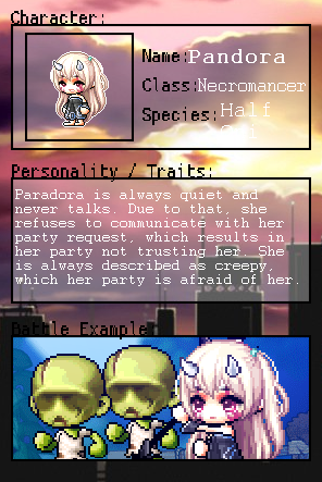 Oracle came from an island far from where she is now. She came to MapleFantazies due to circumstance at a young age. She came at first to study her magic and get stronger but bit off more than she could chew. She dropped out of the academy to get some extra money, at this point she still had her eyesight. She made a wrong turn during one of her missions and was taken by a group that tormented her and took her eyes from her. She was left in a mess after that, having just lost her mother and was extremely far from home. She managed to get help and started tuning her magic. She works towards avenging herself and somehow gaining her eyes back.