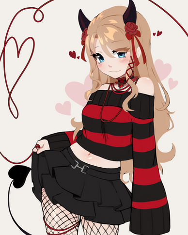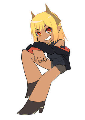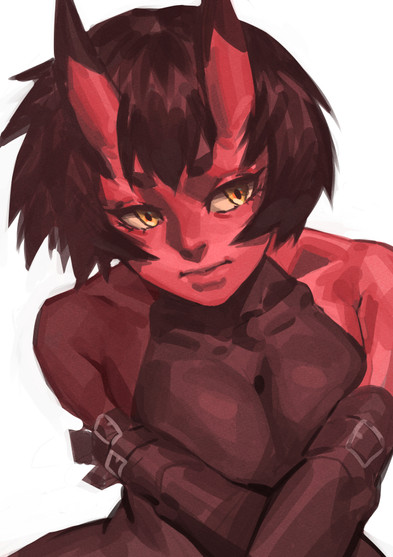 #blonde #demon #doodle #fantasy #horns #oni #shawl #digital_art #bobcut #monster_girl #short_hair #red_skin #clipstudiopaint #torn_leggings