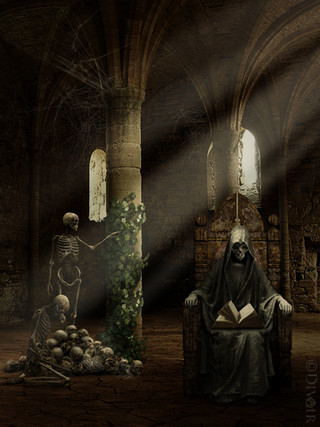 Wonderful! That warm light that's coming out of the book is creating such a nice glow and contrasting the dark and gloomy atmosphere. Great work on the flickering shadows and the lich/zombie, too.