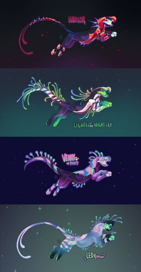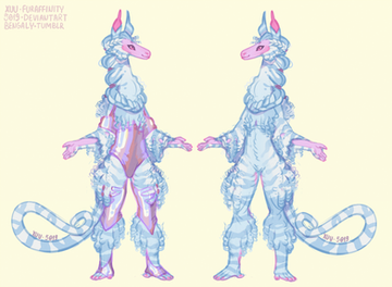 Talking about the Ulgogos, they are afro to curly haired and stripey. The natural colours on their planet are all cold, and as such they come in variations of mint, cyan, blue, purple and pink. Their insides and claws work a bit differently and can have any colour, though it will often be bright and natural. They have a long, prehensile tail, hand-like feets and no pawpads - however the furlessness of their palms extend to their forelimbs. Their ears are very expressive and tubular and their faces are furless.