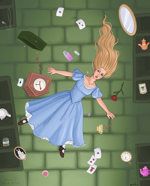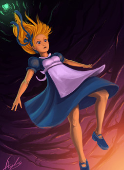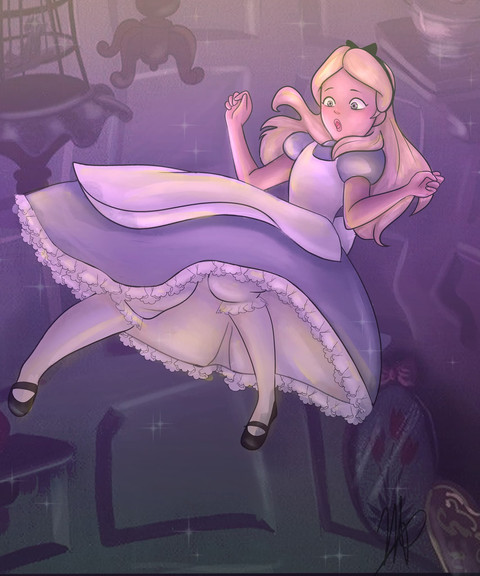 INKtober Day 19!Alice falling down the rabbit hole. I was tired of drawing people standing so I tried a new fun position and justified it somehow xD I really like this a lot, huzzah magic powers.