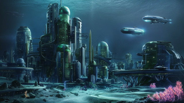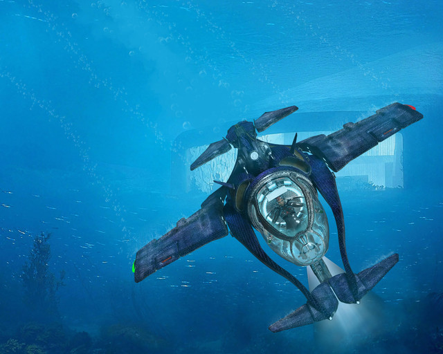 Very dramatic picture with a lot going on--not just the sub (which is cool) but also the bright lights, big fish and buildings in the background.