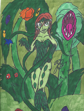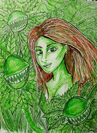 Poison Ivy traditional media drawing.Blue pencil, ink and markers.