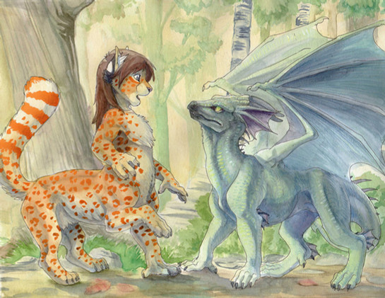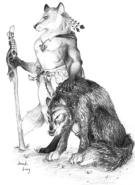 Very nicely done. I'm loving the markings on the wolf, whom I'm assuming is Kyros, and the poses for both characters are well done. Of course, as per the usual, I like the smaller details such as the beads and feathers that adorn their mane and tail. The simple bits of jewelry here and there and the bit of purple at the bottom of her loin cloth are pleasant as well.