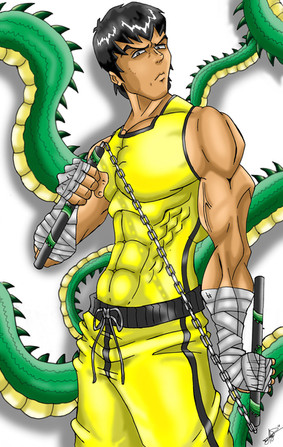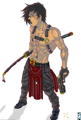 Very neat! The costume design is awesome, and I love your choice of colours. The pose is really cool too, his laidback expression is great. Looking at his hands, the fingers appear kind of stiff compared to the rest of his body, which has really detailed, prominent muscles. I like the detail of his shadow behind him though, this is a neat drawing.