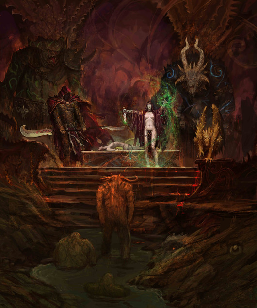 would love to know the story behind this beheading they are too gorgeous to kill... mmmmmhhmm his wife was stolen by the driads because his wife had the rare fire hair that is needed for their god for a sacrificial ritual that gives them their powers now he vows to kill them all...??? meh maybe his daughter is taken and his wife hates his guts for letting it happen??? OR he fell in love with that one he killed and there is something more sinister happening in the driad clan and she begs him to kill her in order to escape??? AAAHhh too many possibilities... very well done though i love it