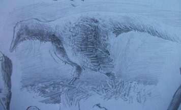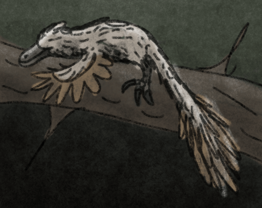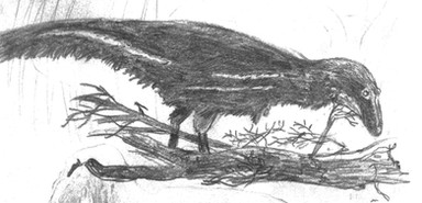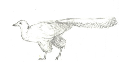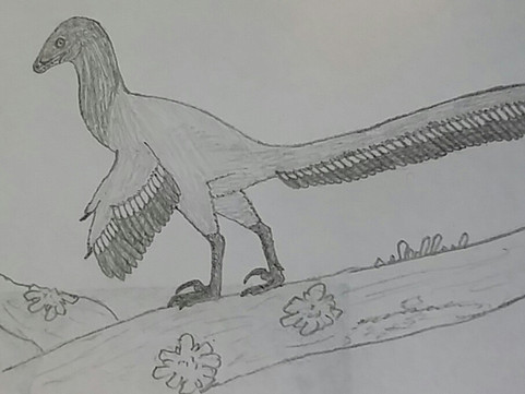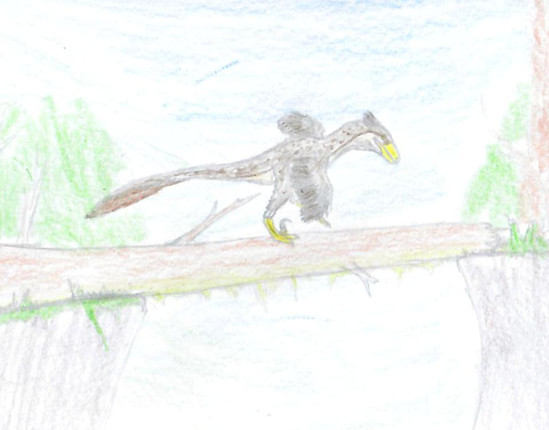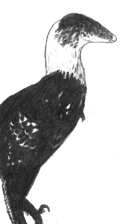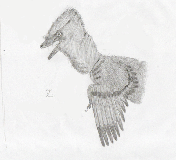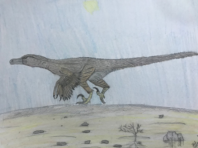 This drawing, drawn without reference, was supposed to depict a Sinornithosaurus or similar Microraptorine gliding down from a tree or something. It had legwings, but halfway through the drawing I noticed that, with the arm wings held the way they were, it didn't look like it was gliding. Instead of changing the arm wings, which I had worked really hard on, I just rubbed out the leg wings! So, now it is a Dromaeosaurid with big wings, using them to control itself as it falls.Drawn over the course of three days (not straight drawing, of course) with pastel pencils and Graphite.