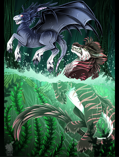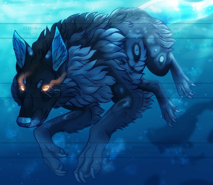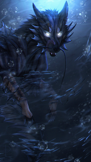 Aaah, this is so cool! <3 I love how you did his face, so reptile-like but still very canine! The water looks pretty goo too, water is so difficult to draw argh ;__; Also, the colors of the background match the character so well! <3