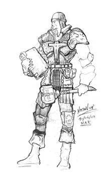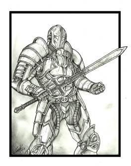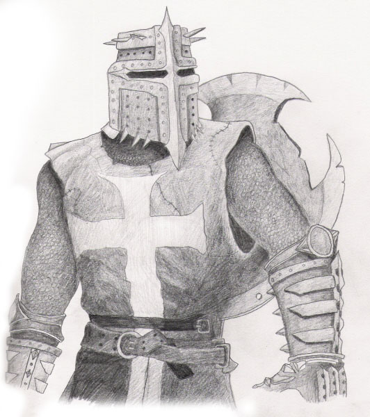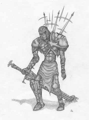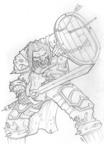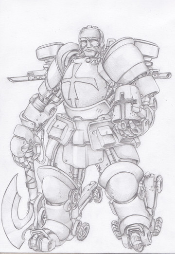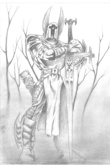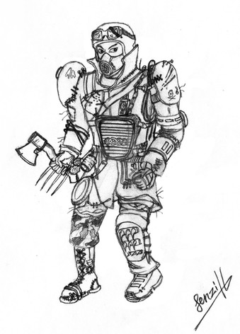 The wasteland is harsh and merciless. But there is life on the barren lands. Artisans, merchants and even farmers create small settlements where they trade, supply adventurers with provisions and engage in barter with looters. The house of this artisan was burned by desert robbers. They tortured him and his family for fun, then they were thrown into the greedy flames of a burning dwelling. But the warrior did not die in the infernal hot air of fire. His thirst for revenge absorbed the heat and light of the flame, his eyes lit up with red-hot coals, and flames burst out behind his back during his rage! With a burning ball, he rolls through the parking lots of desert robbers, sparing no one. Only the buzzing of his chainsword, the crunch of bones and tearing flesh breaks the silence of the night, and in the morning there remains the smell of burnt meat from the robbers who were once a threat. Travelers who have found these ruined parking lots know that this is the work of Fiery Retribution...Drawing board 210×297 мм ( ISO 216), graphite pencil.