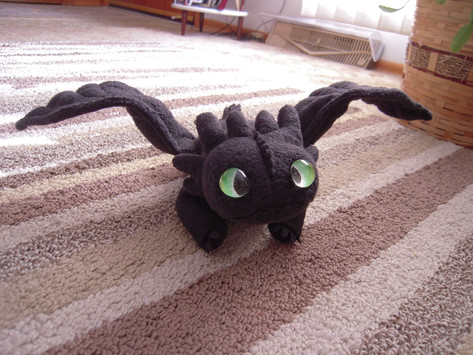 It's Toothless from How To Train Your Dragon! He is 12 inches in height, 24 inches in length including the tail, and is made entirely out of minky and suedecloth.